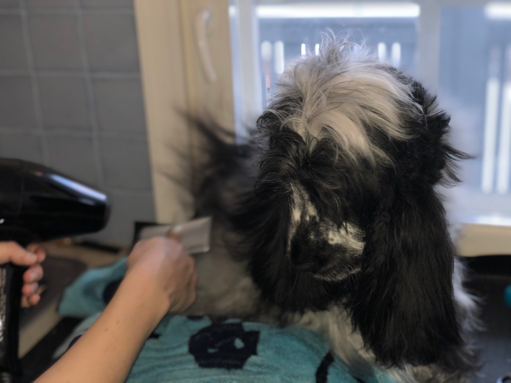 Enää on jäljellä föönaaminen. Tuollaista pitkää silkkistä turkkia ei nimittäin voi jättää kuivumaan itsekseen, muuten takut ovat taattuja ja koira märkä puoli päivää. Voitte kuvitella, ettei ihostaan herkkä koira juurikaan arvostanut hiustenkuivaajan puhallusta. Samalla systeemillä olemme kuitenkin saaneet senkin sujumaan ja koira on suorastaan pettynyt kun se nostetaan pöydältä alas föönauksen päätteeksi. Trimmaan sitä jossain määrin itsekin, mutta varsinaiset trimmaukset hoitaa joku osaavampi. Näissä tilanteissa minulla ei välttämättä ole edes makupaloja mukanani, koska trimmaajat eivät tietenkään käyttäydy samalla tavalla kuin minä harjoituksissani. En voi vaatia koiraa tekemään samoja asioita trimmaajan kanssa kuin minun kanssani, koska en ole sitä opettanut. Koiralla on kuitenkin niin paljon onnistuneita ja miellyttäviä harjoituksia takanaan, ettei muutaman kuukauden välein tapahtuva trimmaaminen aiheuta ongelmaa, eikä trimmaaminen ilmeisesti ole läheskään yhtä epämiellyttävää kuin takkujen selvittäminen, peseminen ja föönaaminen.